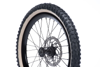 リム内部を二重構造にして、軽さと強度を両立。ブラックカラーは耐久性のあるアルマイト加工で色付け。スポークは14番の丈夫なステンレススポークをロードバイクと同じイタリアン組みで仕上げています。4回の振れ取り調整を行い、最後に全スポークのテンションをチェックして最終調整。一見すると普通のホイールに見えますが、ホイールバランスを突き詰めることで、スムーズな加速と安定したコーナリング、長期間振れの出にくいホイールを実現。 |